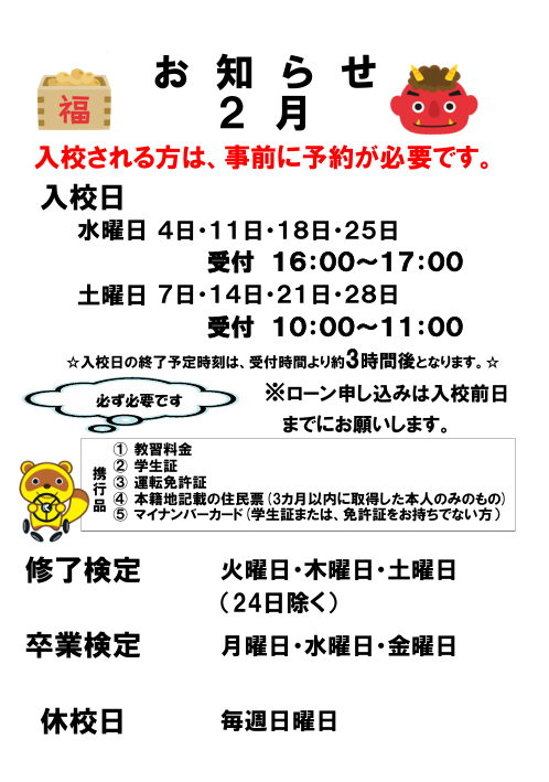令和8年2月度 入校案内