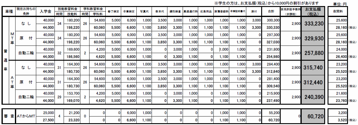 込)/卒業検定 1回 6,000円(6,600円税込)仮免学科1回 1,800円(非課税)